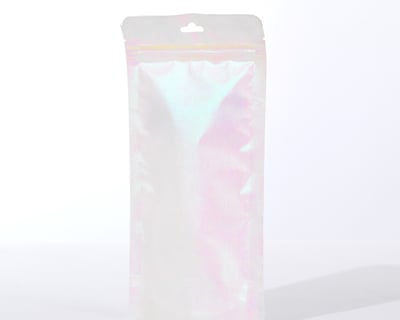 Transparent stand-up pouch with soft pink gradient—ideal for feminine hygiene products, intimate care, or skincare. Moisture-resistant, printable, and perfect for retail display.